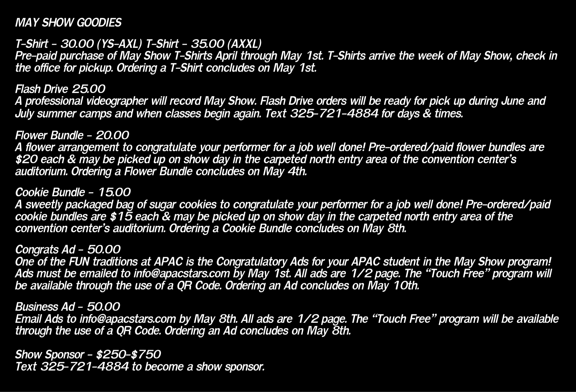 $45 May Show Fee is collected for every May Show performer and is due with September’s tuition. This fee assists APAC in paying for the increased rental expense of the Convention Center.
